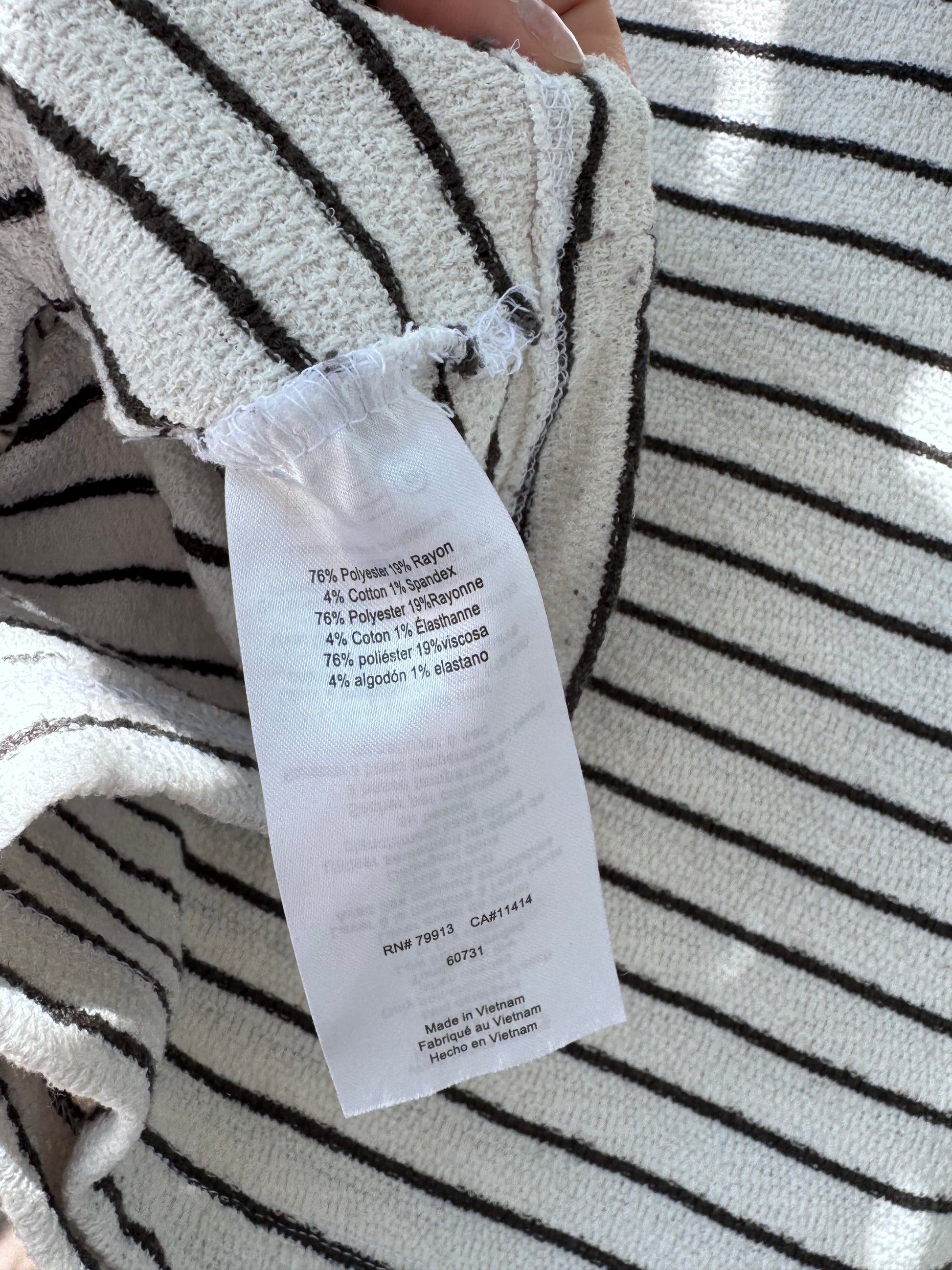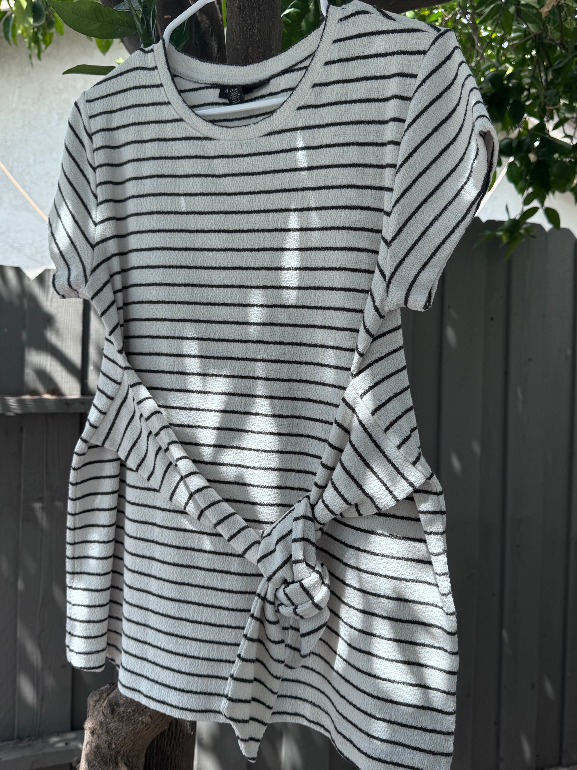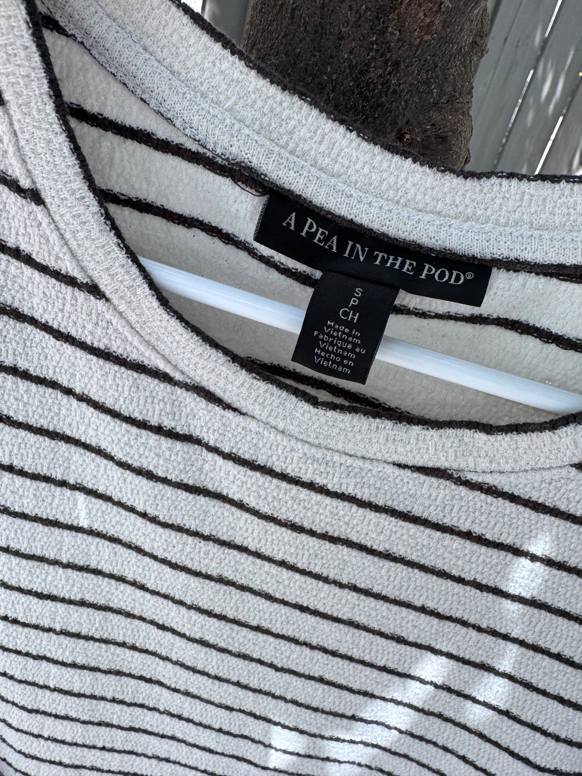 Effortlessly chic and comfortable, this maternity top from A Pea in the Pod features classic black and white stripes with a flattering tie-front detail. Made with a soft, stretchy fabric blend (76% polyester, 19% rayon, 4% cotton, 1% spandex), it provides both style and flexibility for expecting moms. Short sleeve with a round neckline, size Small, made in Vietnam. Perfect for casual wear or layering with cardigans and jackets. Excellent condition.