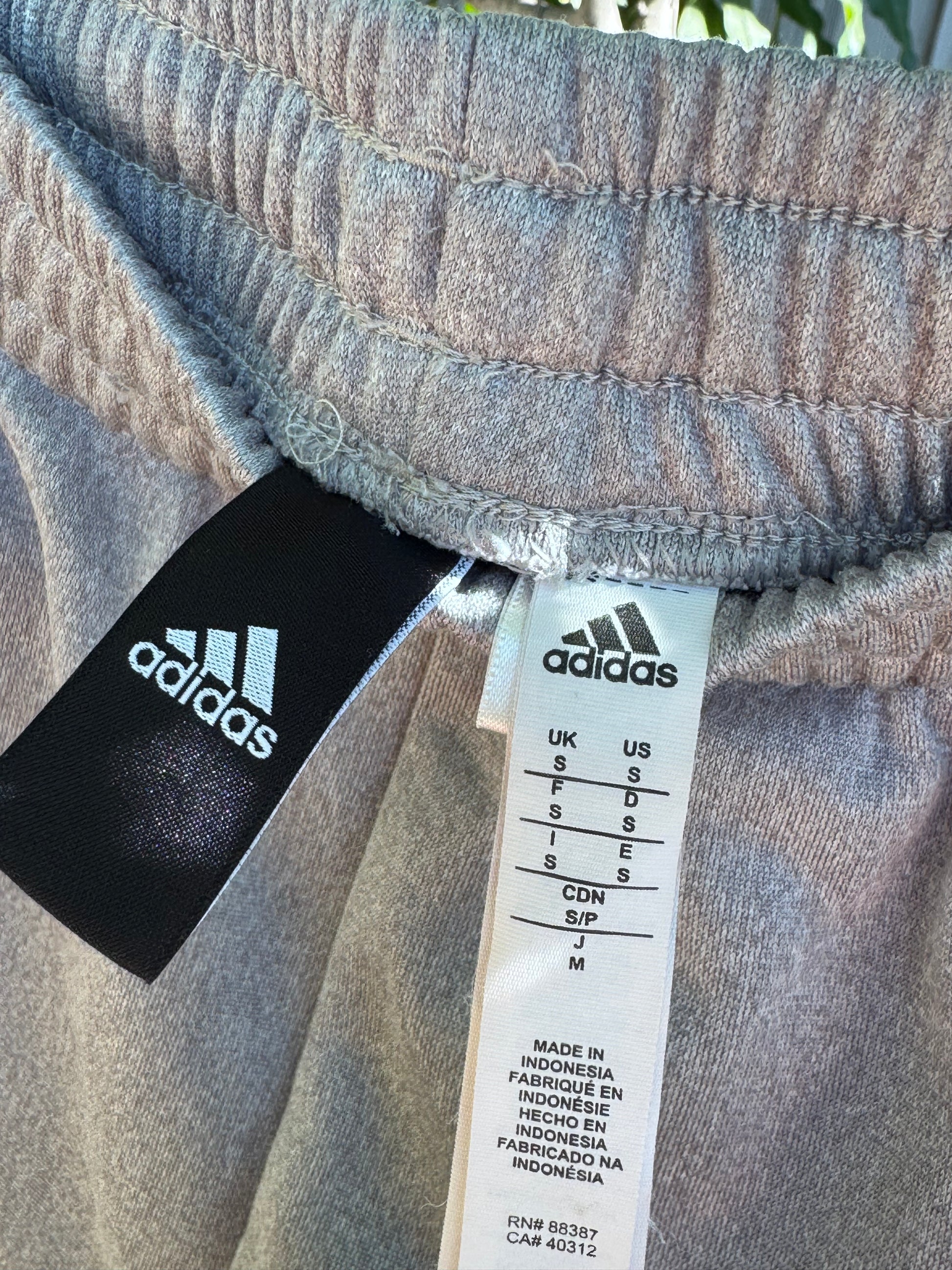 These Adidas gray track pants feature the iconic three white stripes down each leg for a clean and sporty look. Made with a comfortable elastic waistband, they include side pockets for convenience and zippered ankles for adjustable fit and style. Crafted in Indonesia, these pants are a size Small (US S) and offer a relaxed yet athletic fit perfect for workouts, casual wear, or lounging. Simple, versatile, and timeless Adidas style. Excellent condition.