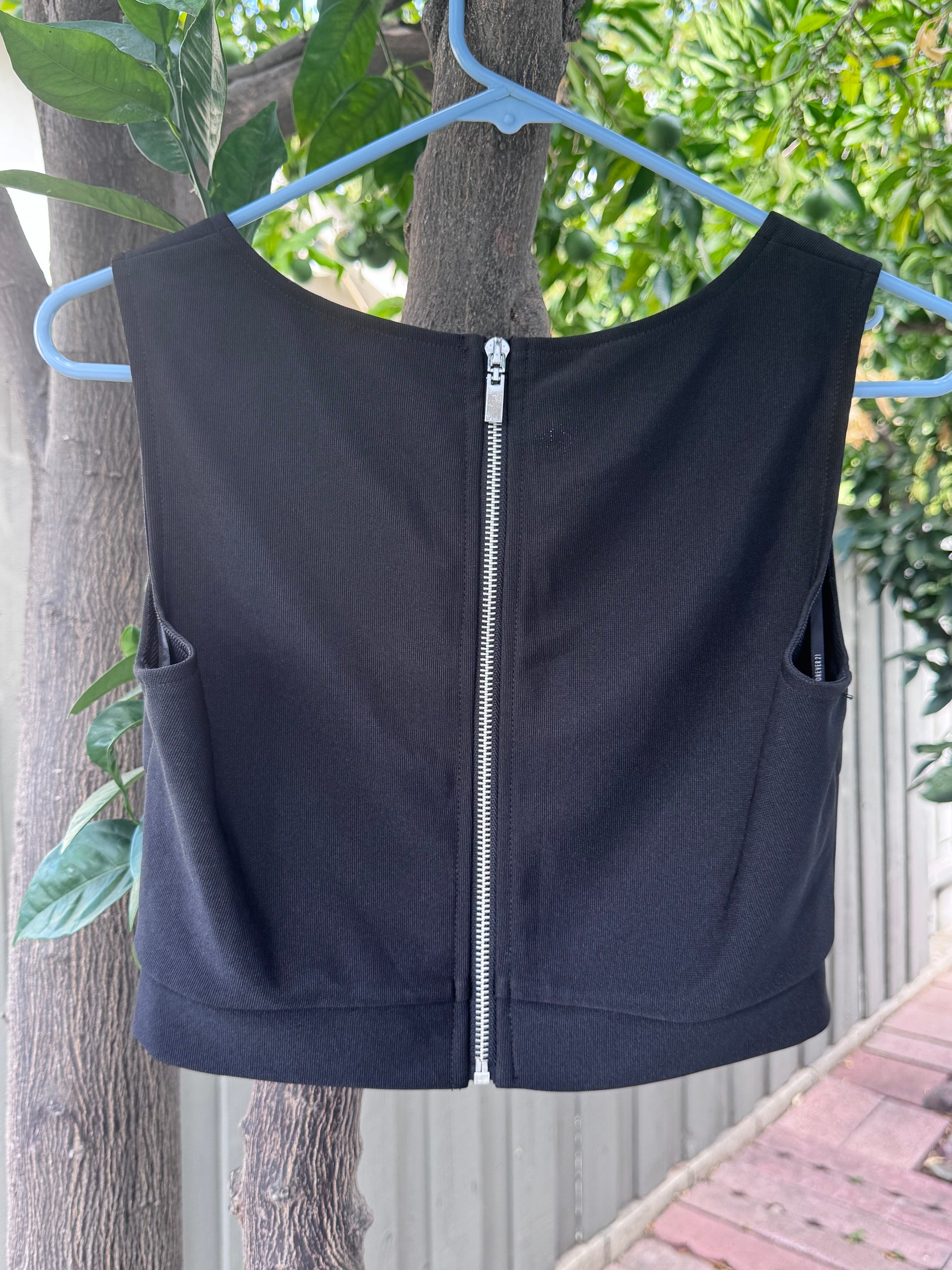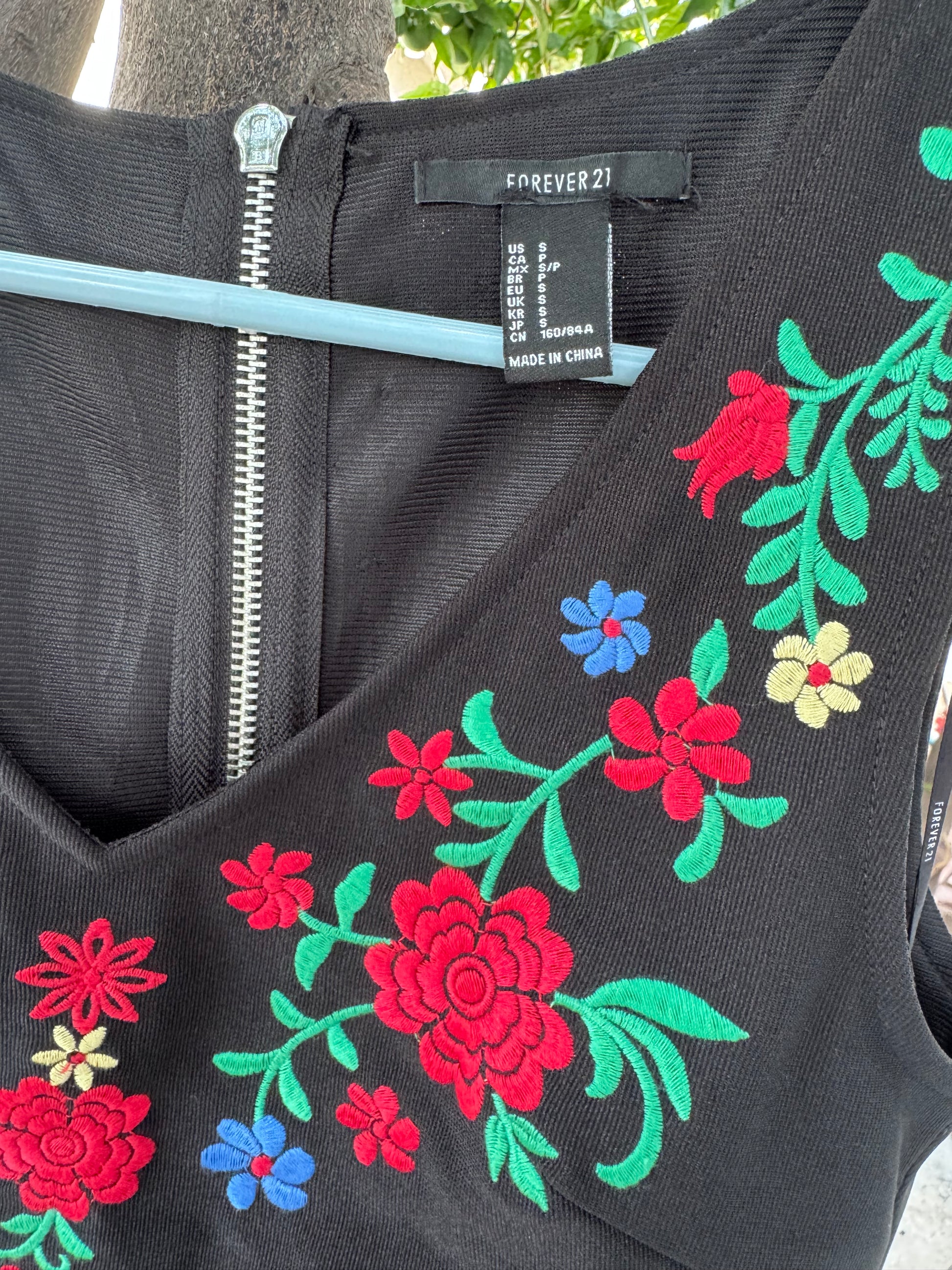 This stylish Forever 21 black crop top features vibrant floral embroidery in red, blue, yellow, and green, adding a bold yet feminine touch. Designed with a sleeveless cut and a flattering V-neckline, it includes a back zipper for easy wear. Perfect for pairing with high-waisted jeans, skirts, or shorts, this piece blends boho-chic and modern street style effortlessly. In excellent condition.