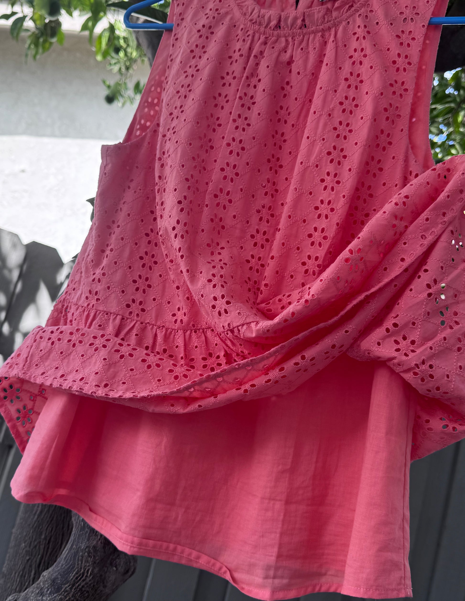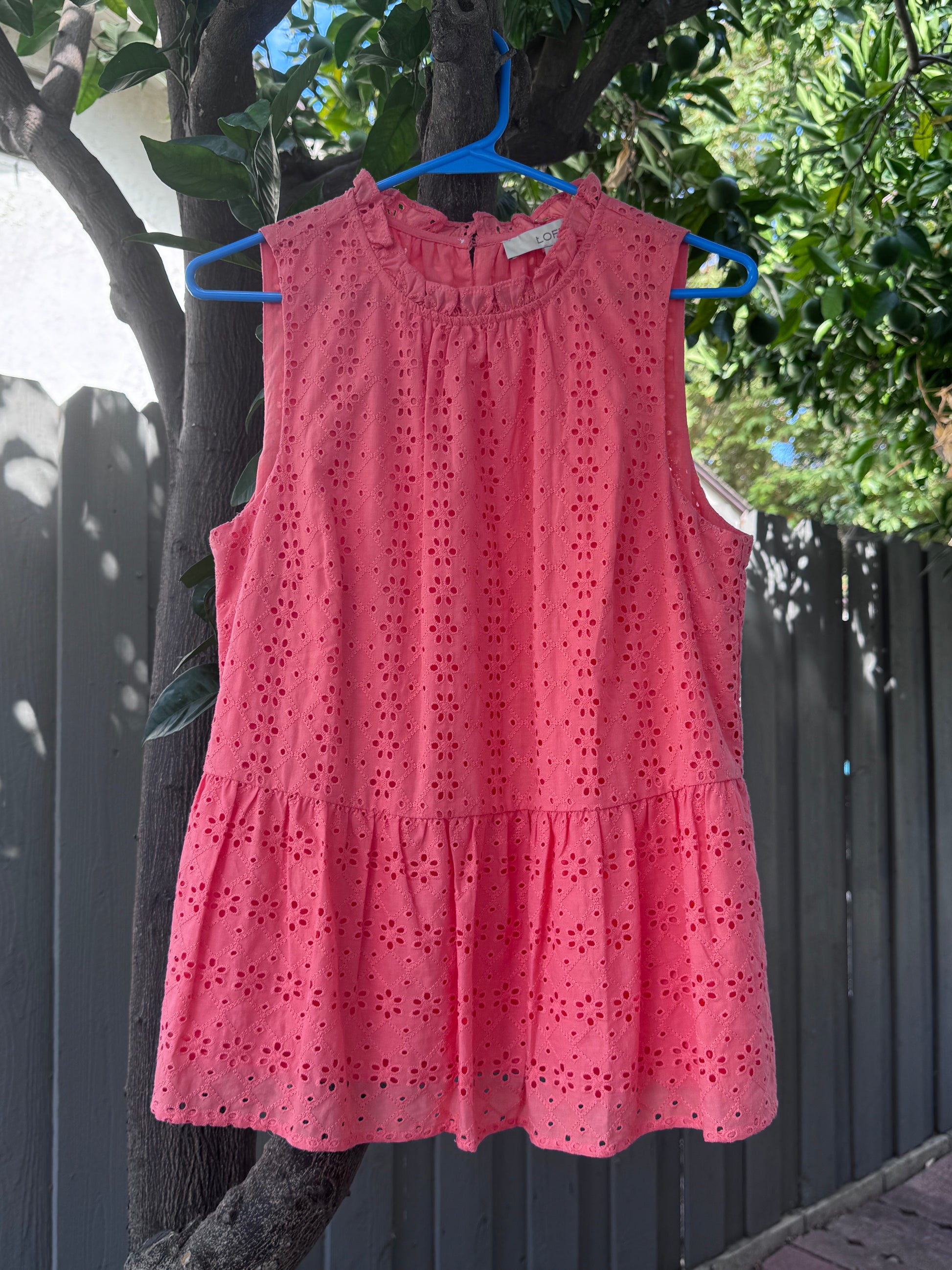 This LOFT women’s sleeveless peplum top comes in a vibrant coral shade with delicate embroidered eyelet detailing throughout. The design features a ruffled neckline, back button closure, and a tiered peplum hem for a feminine and flattering fit. Fully lined for comfort, the lightweight cotton fabric makes it perfect for spring and summer styling. A versatile piece that pairs beautifully with jeans, skirts, or shorts for a chic casual look. Excellent condition.