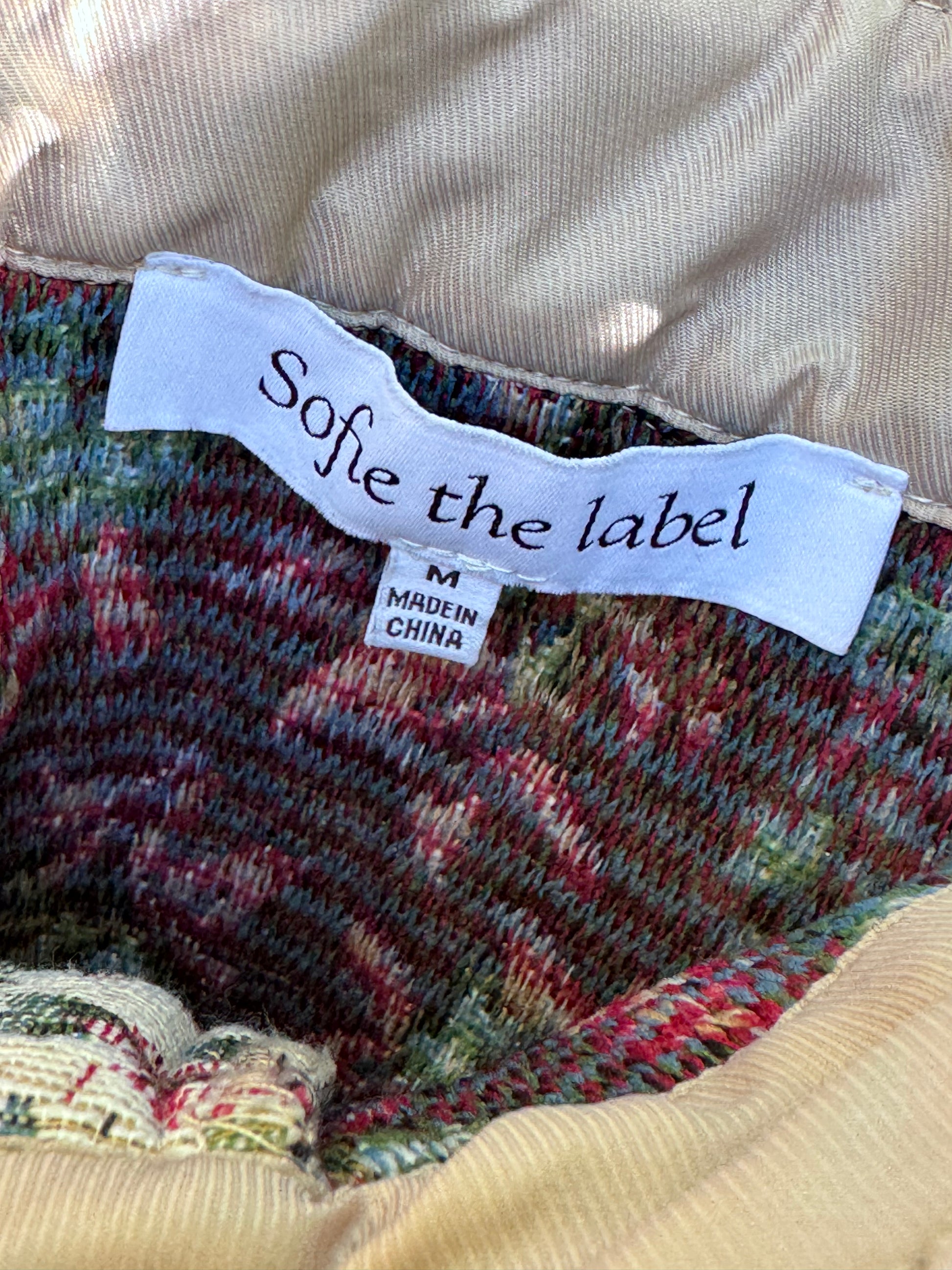 A beautiful statement piece from Sofie the Label, this tapestry-inspired mini skirt features an allover vintage-style floral print in muted tones of burgundy, green, and cream. The ruffle hem adds a feminine, flirty touch, while the side zipper ensures a comfortable fit. Fully lined for comfort and quality. Size M, made in China. Perfect for pairing with a simple blouse, cropped sweater, or boots for a romantic vintage-inspired look. Excellent condition.