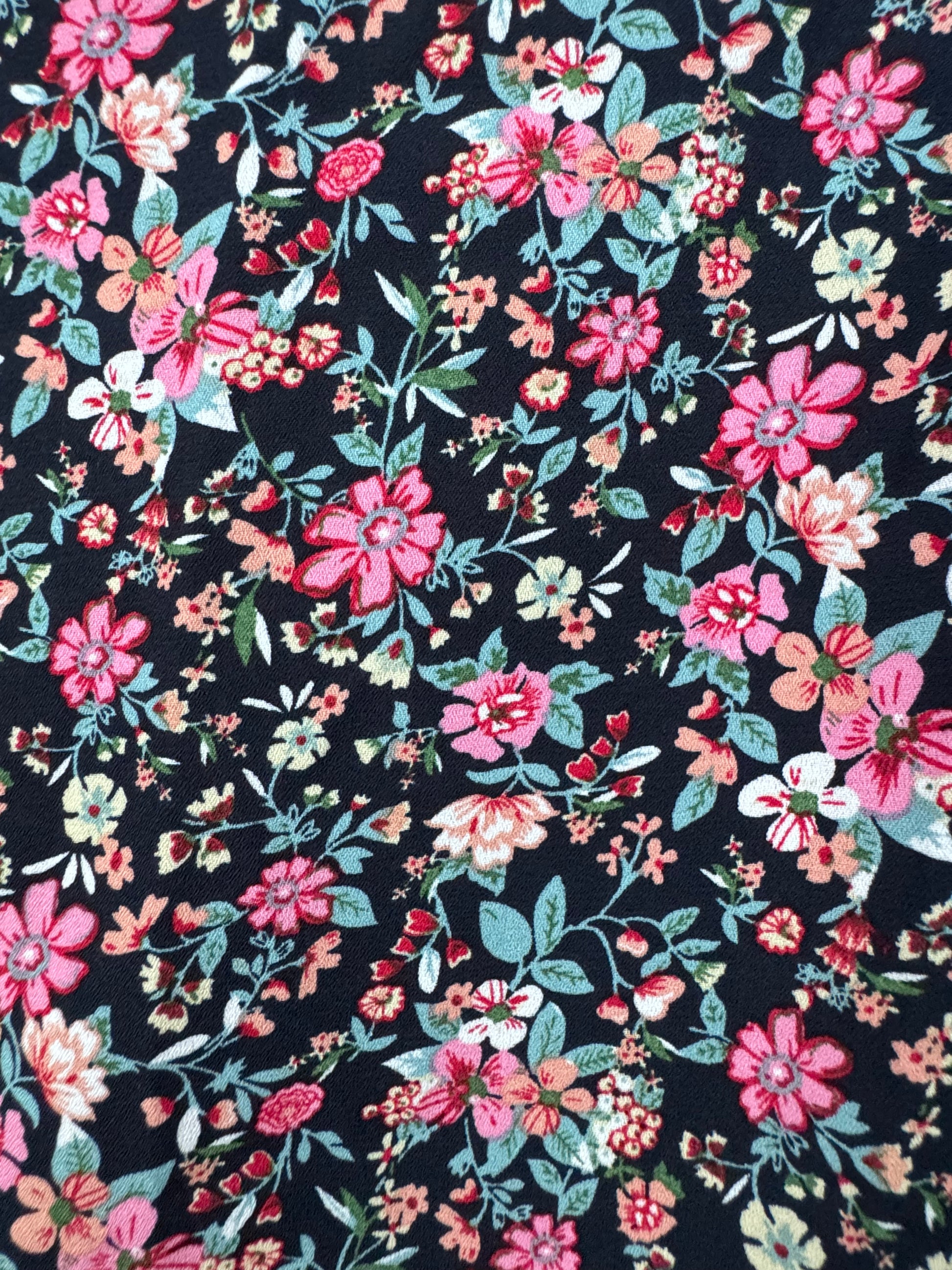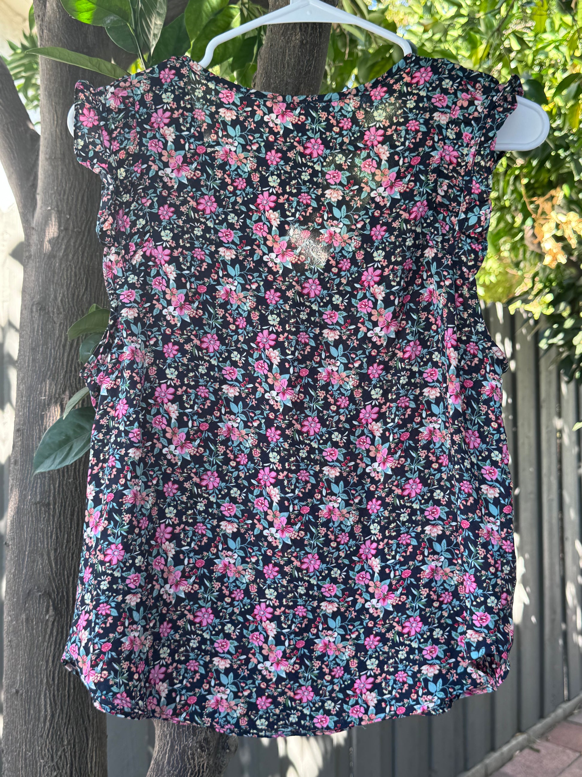 Lightweight and feminine navy blue blouse from Timing, featuring a vibrant all-over floral print in pink, coral, and teal tones. Designed with ruffle-trimmed sleeves and a flattering v-neckline for a breezy, stylish look. Perfect for casual wear, work, or layering under a jacket. Excellent condition.