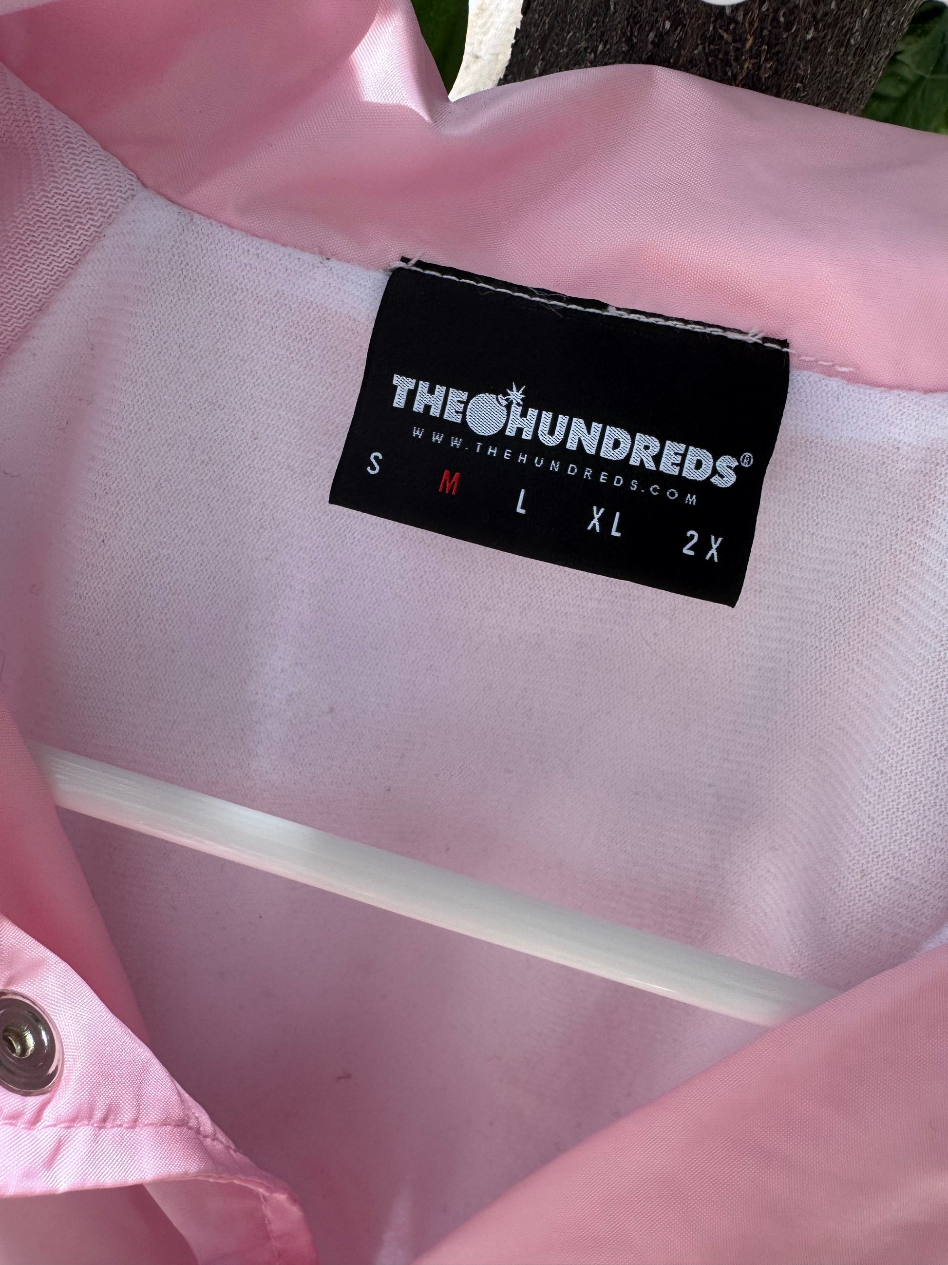The Hundreds is an LA based streetwear and lifestyle brand founded in 2003 with a strong emphasis on authenticity and community. This light pink bomber jacket is in amazing condition, with two front pockets, snap button closures, and front and back prints. Nice, light fit.