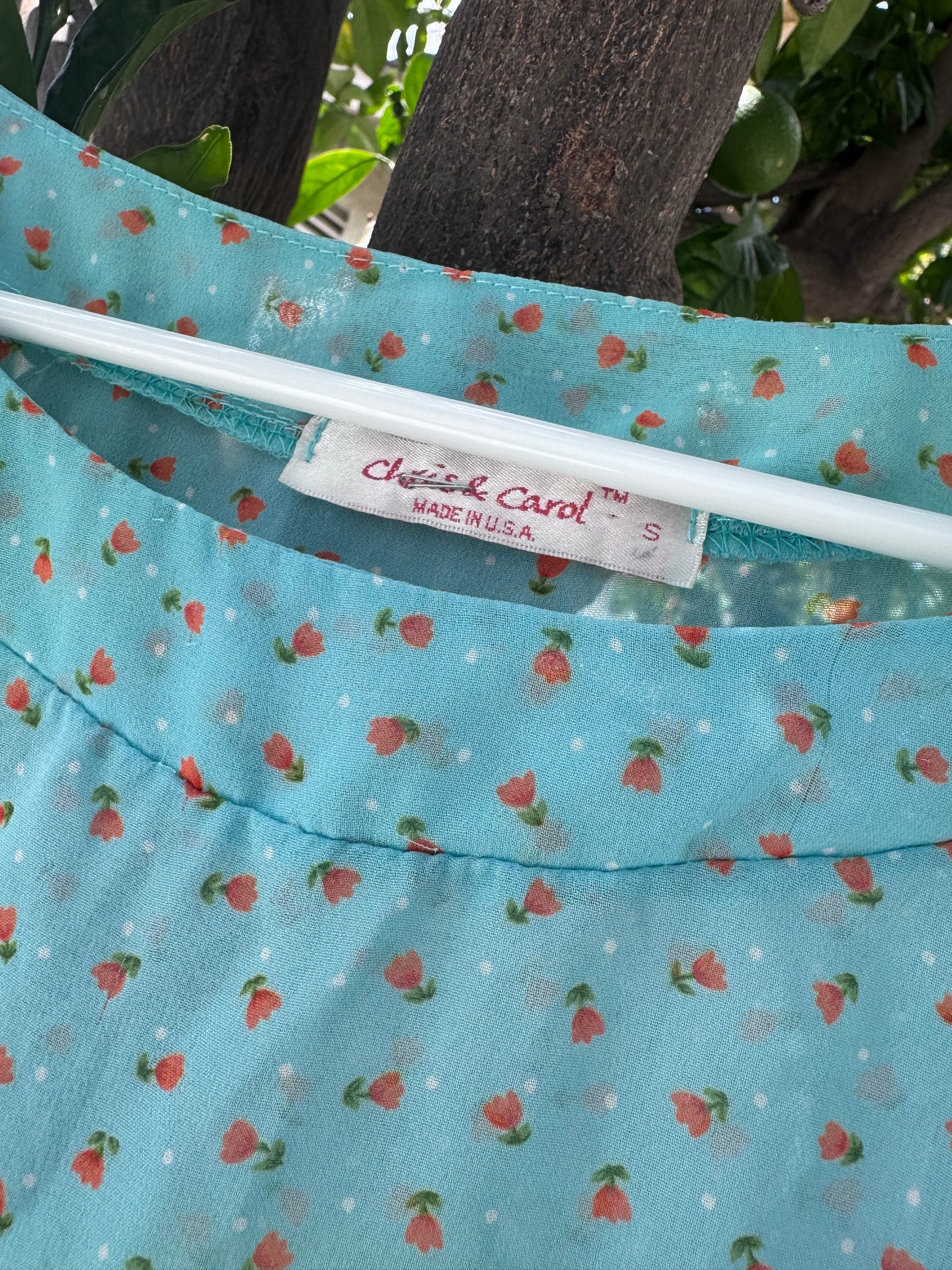 Super cute and lightweight aqua blue blouse with tiny red-pink floral print and white polka dot details. Features a wide scoop neckline, short flutter sleeves, and a relaxed, breezy fit. Perfect for summer, layering, or a vintage-inspired look. Great condition.