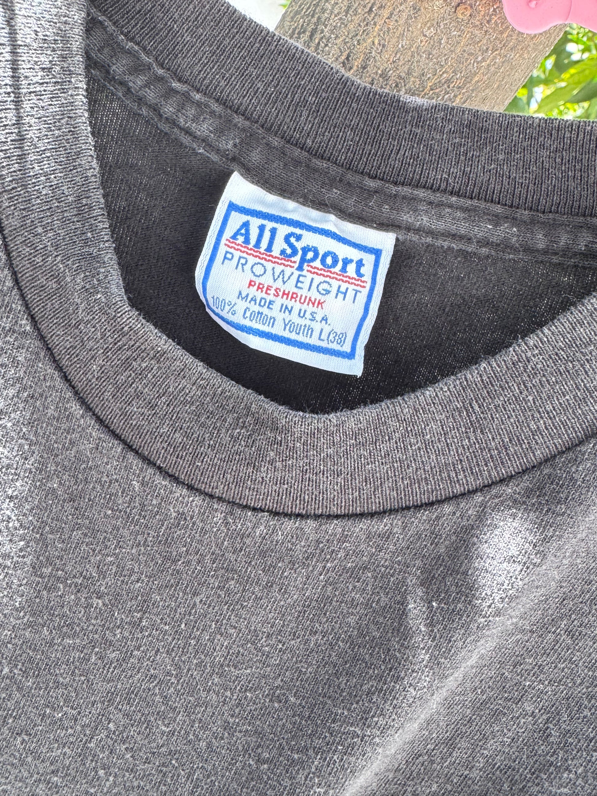 Rare vintage biker tee from the legendary Boot Hill Saloon, straight out of Daytona Beach’s Biketoberfest ‘96. Single stitch 100% heavyweight cotton on an AllSport Pro Weight tag. Features a small front hit, with a bold back graphic with skeleton + pumpkin-head riders, an eagle, and classic gothic lettering. Great vintage fade adds natural wear to the look. Youth Large — Fits like adult XS/S.