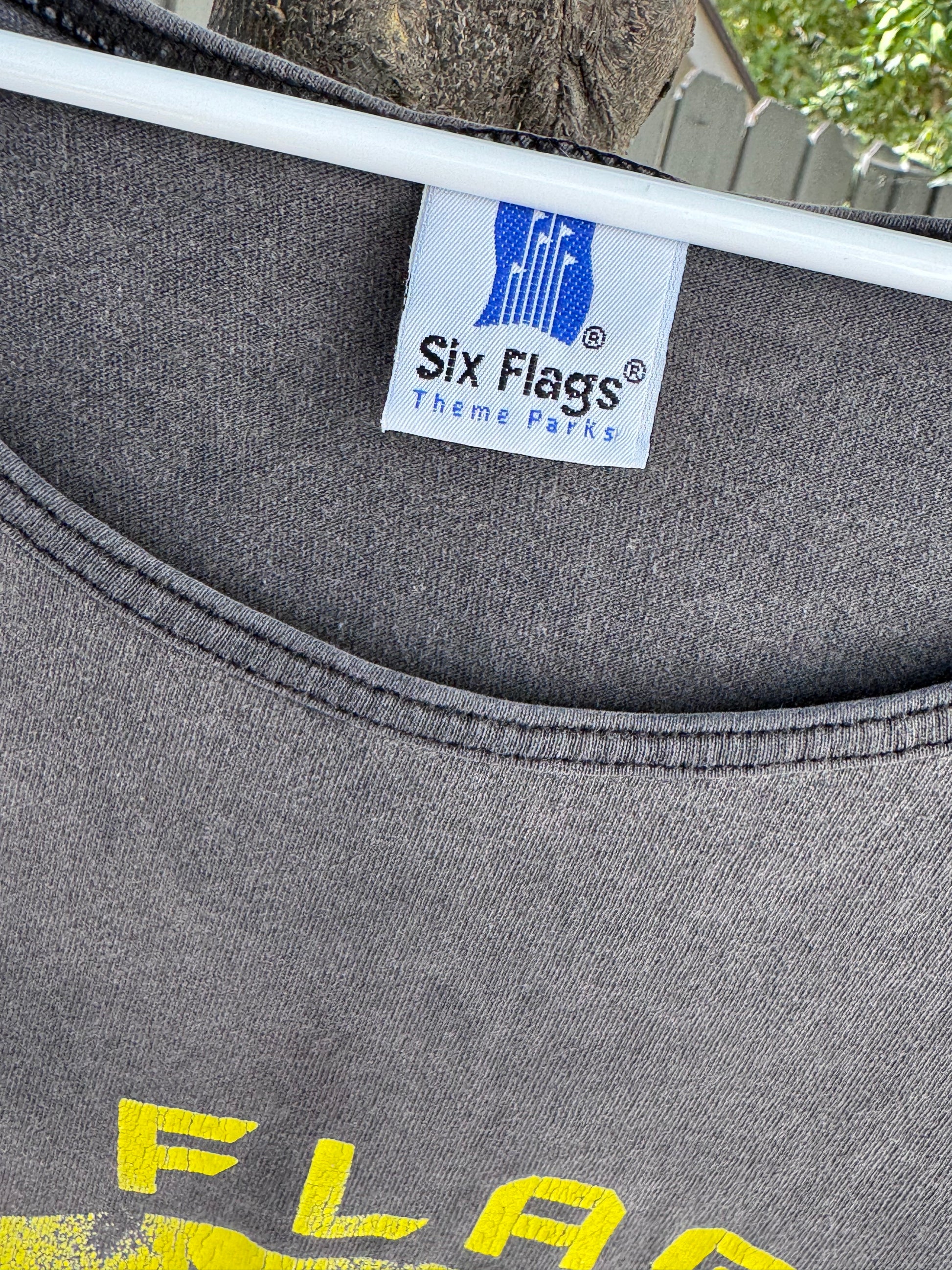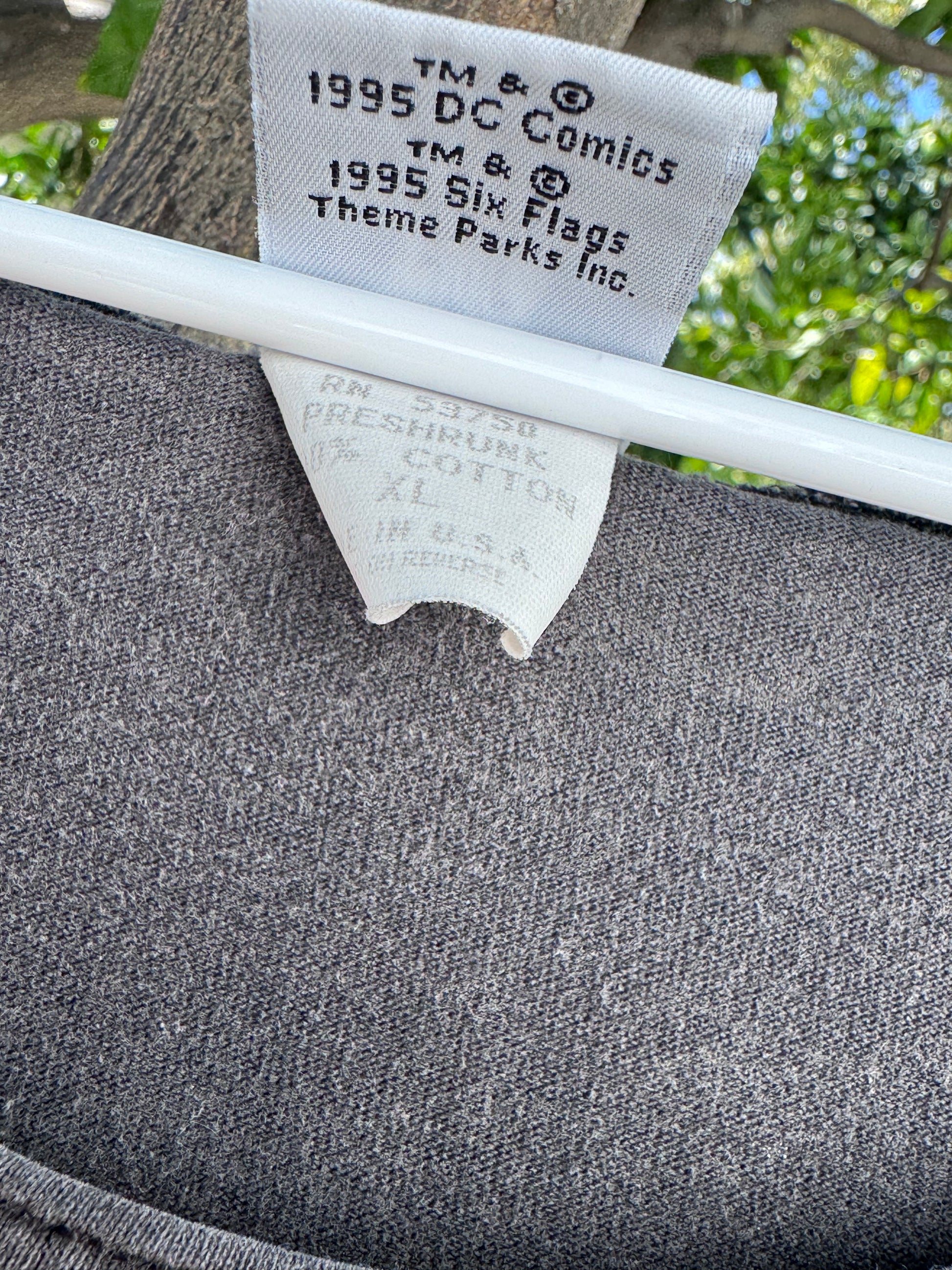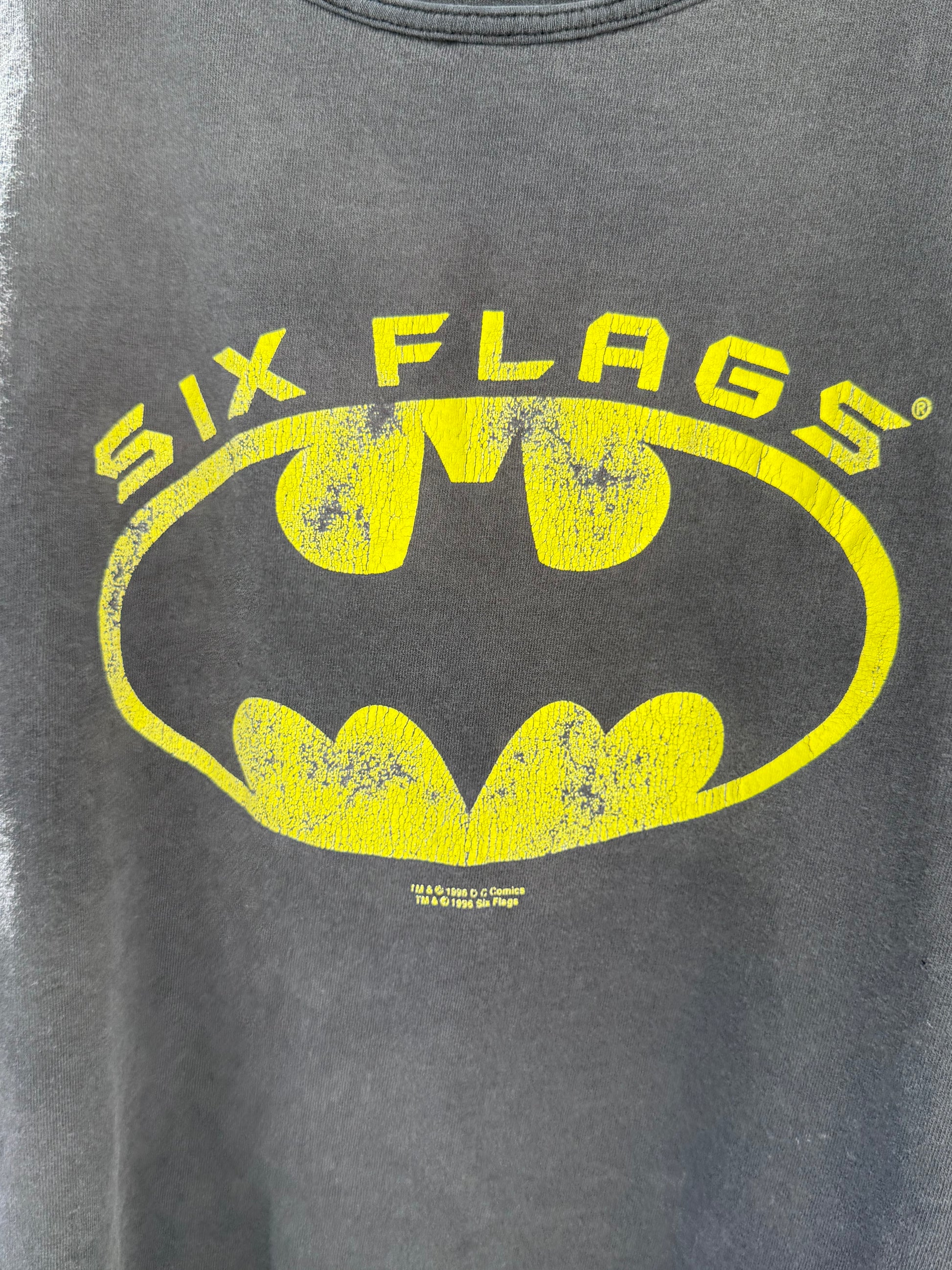 Rare vintage 1995 Six Flags Batman tank top featuring the iconic yellow Batman logo across the chest. Licensed by DC Comics and Six Flags Theme Parks, this piece is a true collectible from the mid-90s. Made in the USA from 100% preshrunk cotton, size XL, with a naturally faded black/charcoal wash and cracked print giving it an authentic vintage patina. Perfect for fans of Batman, Six Flags memorabilia, or vintage comic apparel.