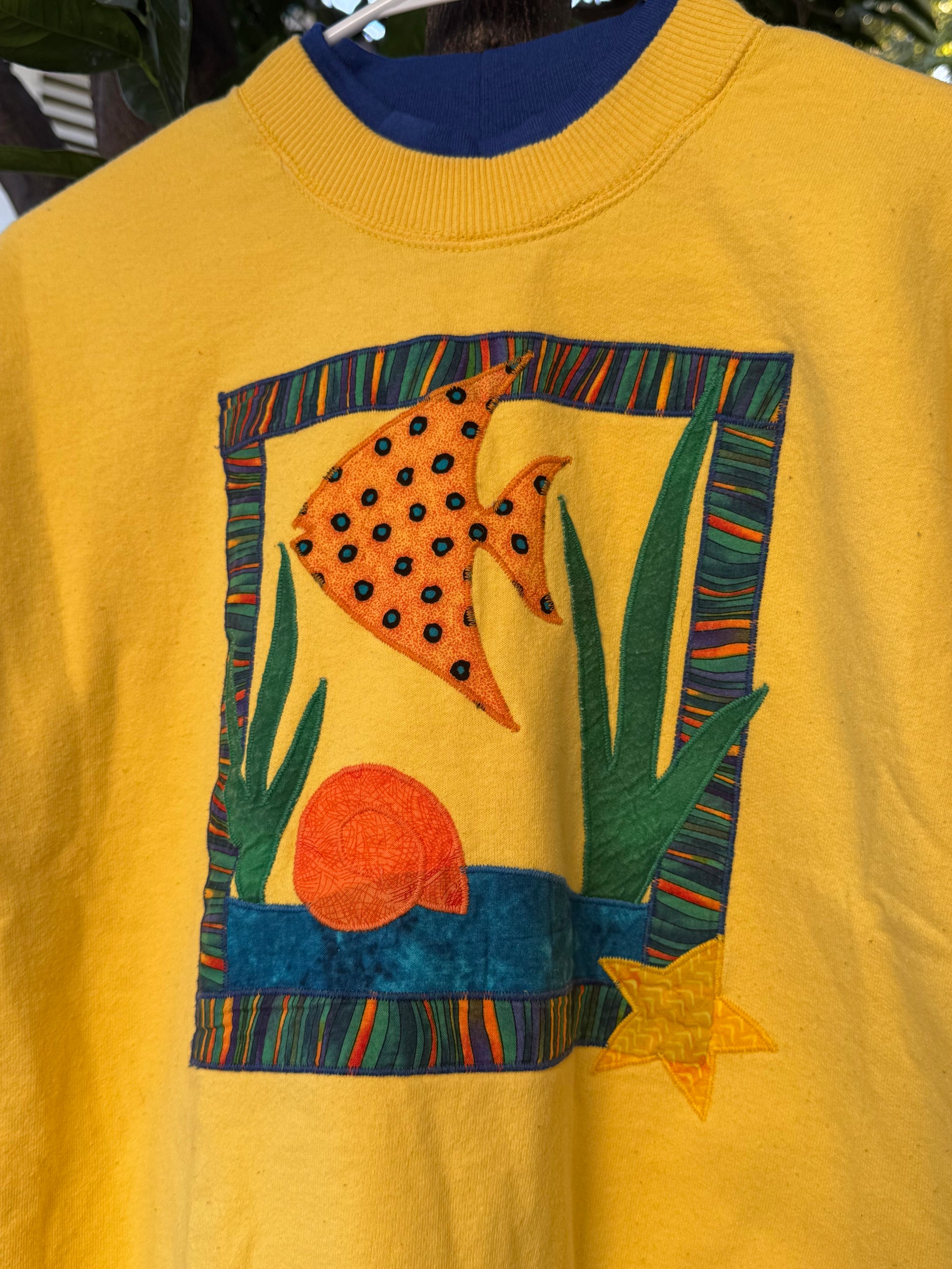 Step back into the 90s with this bold and colorful vintage Gildan Heavyweight Cotton sweatshirt. Featuring a vibrant appliqué-style fish and sunset design framed with tropical accents, this piece captures the quirky, playful fashion of the late 1990s to early 2000s. Great preloved condition.