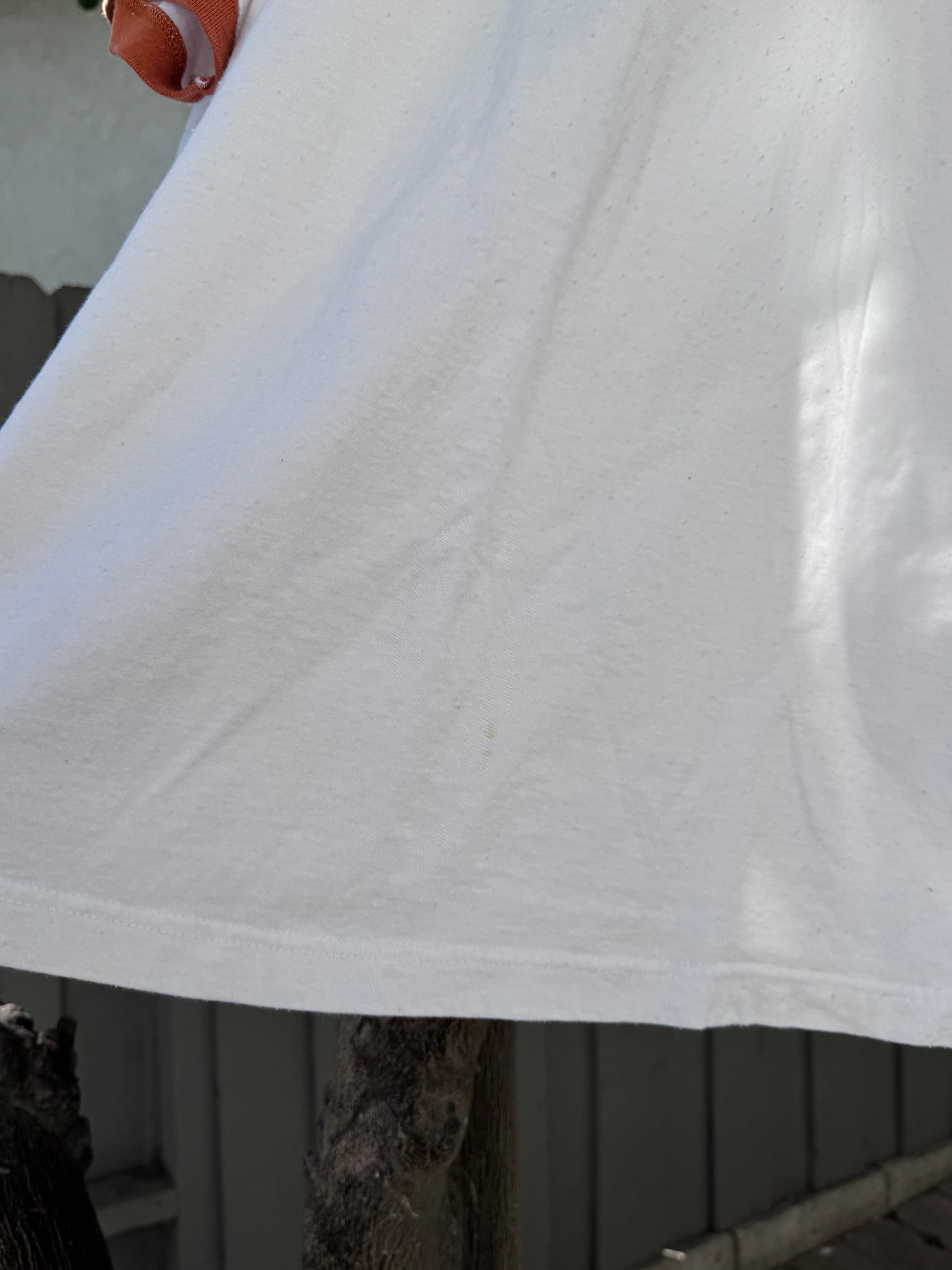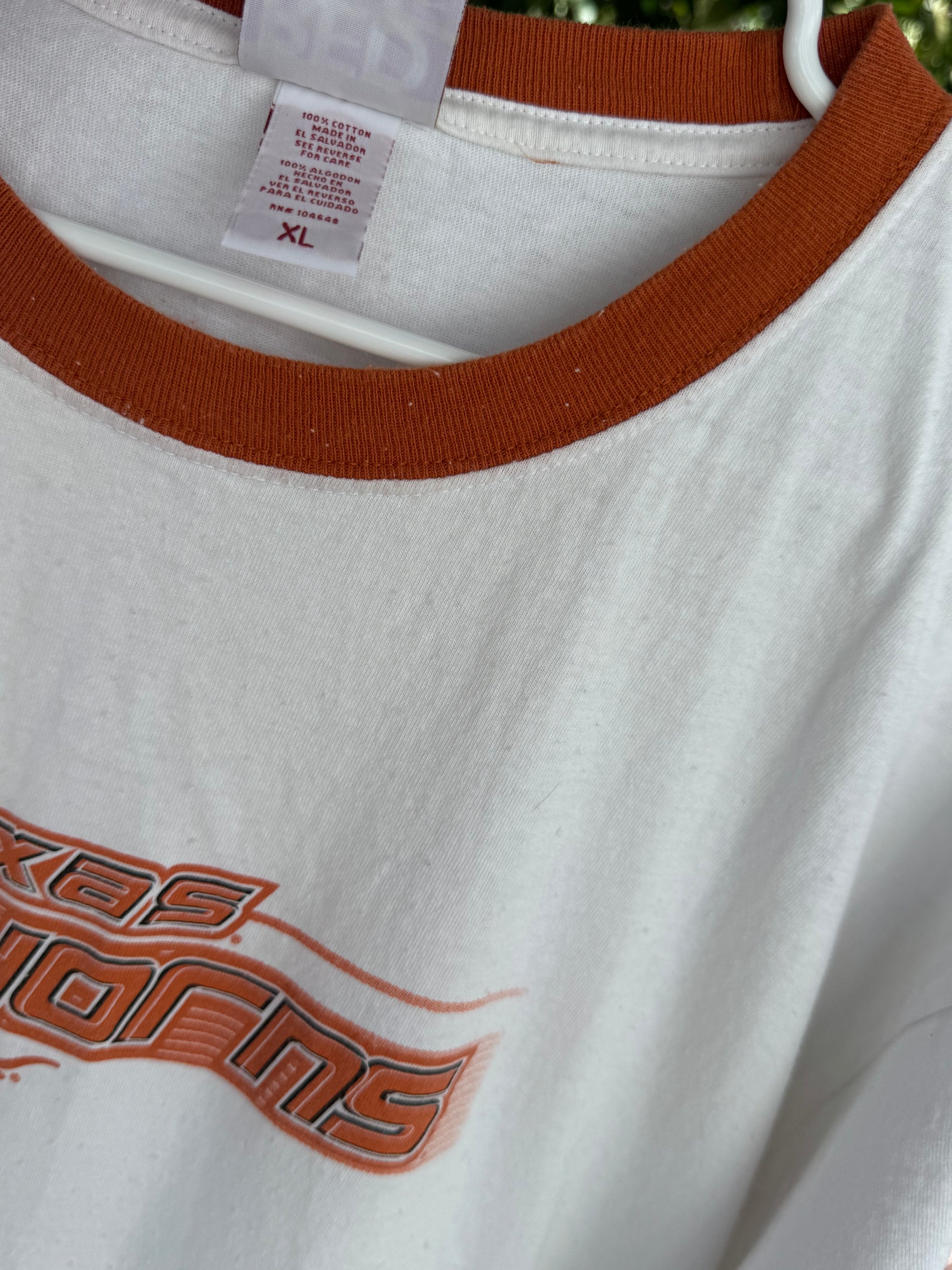 Classic University of Texas Longhorns ringer tee featuring a bold burnt orange graphic across the chest with the iconic Longhorn logo. Designed with a crisp white body and contrasting burnt orange collar and sleeve cuffs for a retro athletic look. Made by Red Oak Sportswear, size XL, 100% cotton, made in El Salvador. Perfect for Longhorns fans, vintage sportswear collectors, or anyone who loves retro college gear. Some piling from wear and wash, and small minor stain (pictured.)