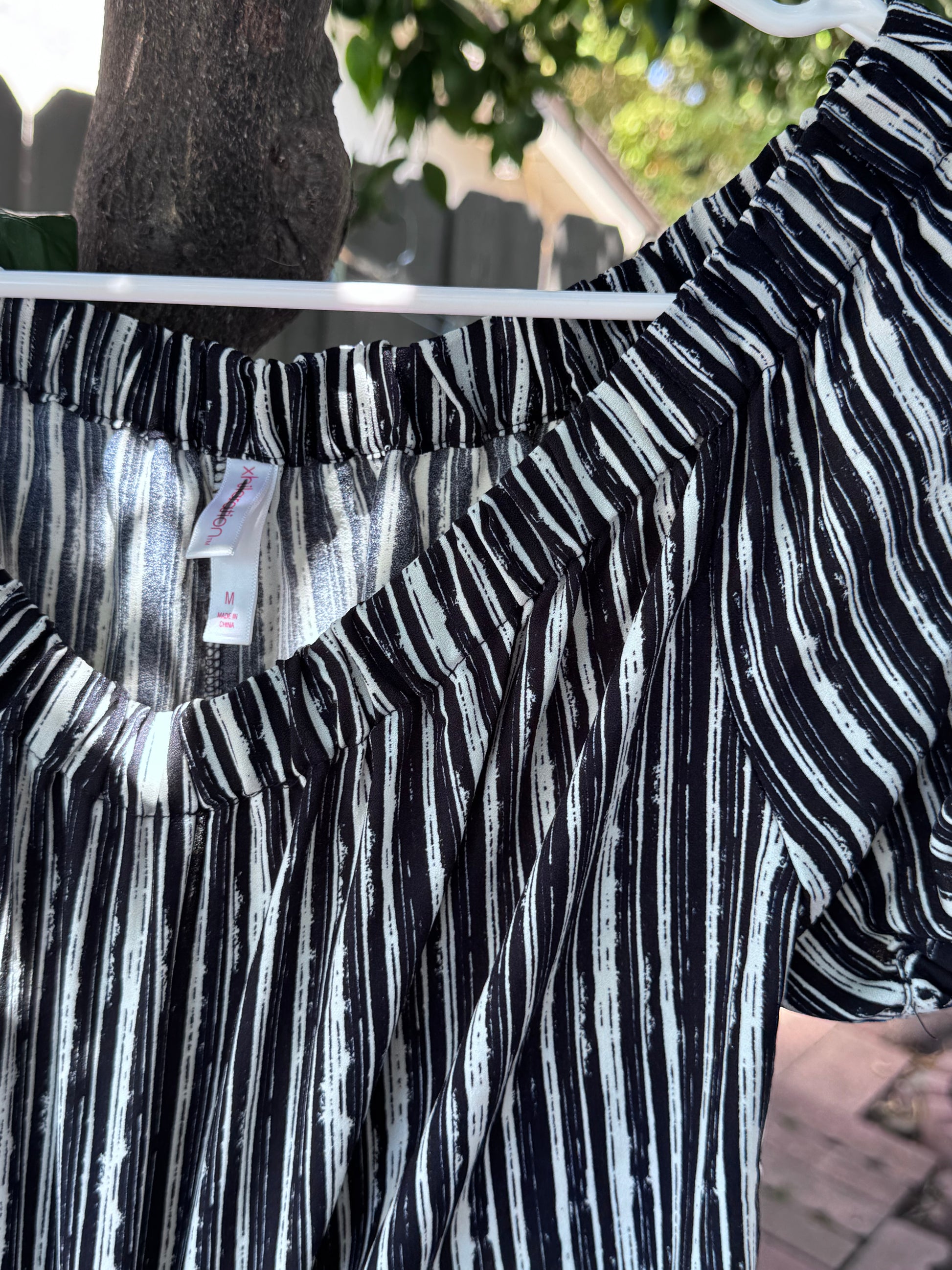 Chic and breezy off-shoulder dress by Xhilaration in navy blue and white. Features a striped pattern throughout, short sleeves with tie accents, and a floral + geometric border print along the hem for a feminine boho touch. The elastic neckline can be worn on or off the shoulders for versatile styling. Lightweight and flowy, making it perfect for warm weather, vacations, or festival looks. Excellent condition.